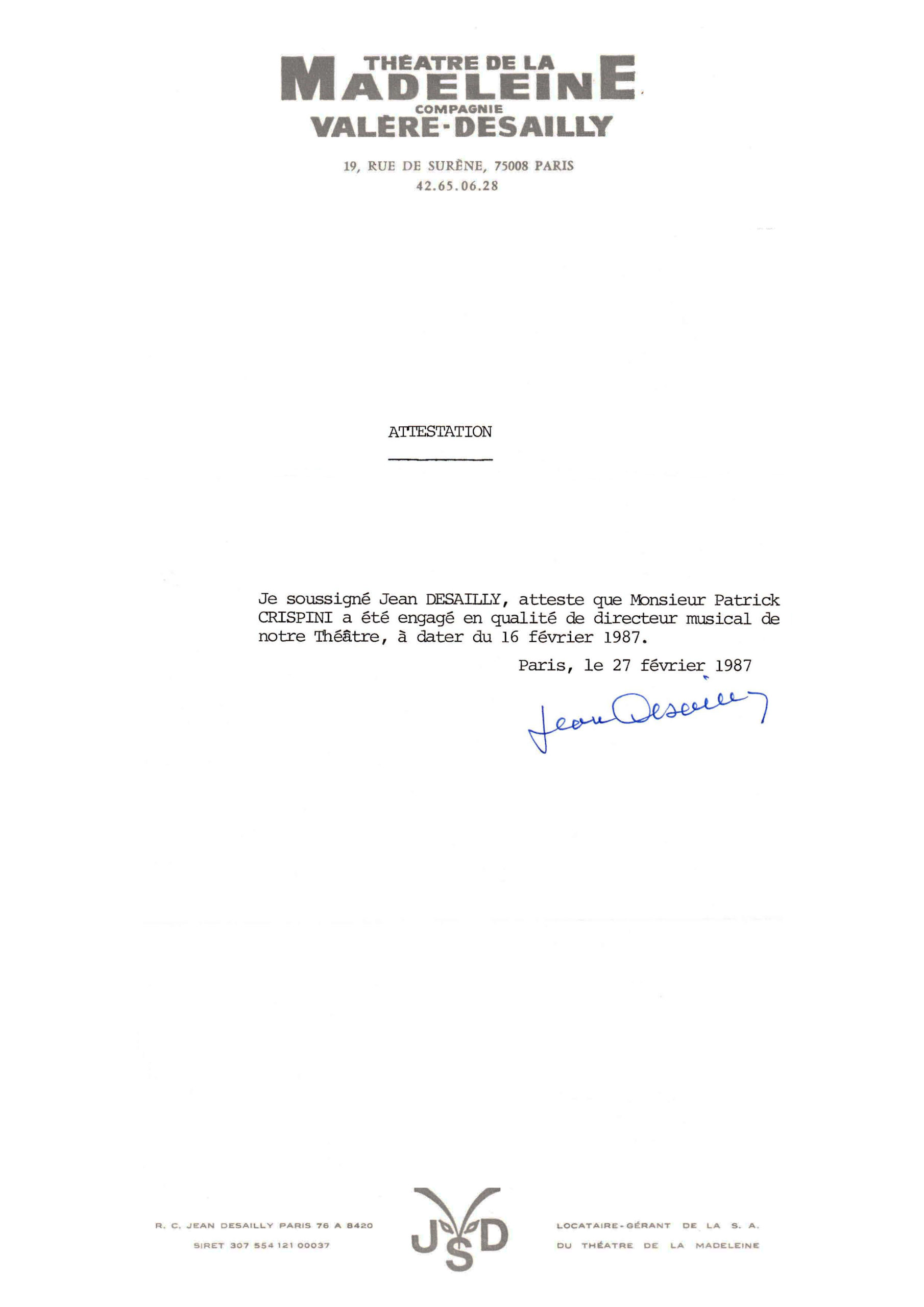 Jean Desailly & Simone Valère : dès l’instant où nous nous rencontrâmes – c’était en 1981 – ce fut pour la vie ! Quelque chose d’inexplicable s’était passé, une sorte d’alchimie amicale et fraternelle qui ne trouve pas à s’expliquer par des mots. Une osmose, une parenté de pensées, une parenté tout court. A mon arrivée à Paris, je ne connaissais personne ou presque. Jean me dit : « Veux-tu être le directeur musical de notre Compagnie ? On n’a pas une vraie saison musicale, mais nos spectacles nécessitent toujours un climat musical, voire une partition originale… Veux-tu t’en occuper ? » Et c’est ainsi que je fus pendant plus de vingt ans un fidèle du Théâtre de la Madeleine – le théâtre de Guitry – où nous vécûmes tant de choses ensemble et, pour un temps, le directeur musical de la Compagnie Valère-Desailly.